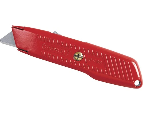 Gebruiksvriendelijk stalen veiligheidsmes. Het mes schuift automatisch naar binnen zodra de schuifknop wordt losgelaten. Verder is een mes met afgerond snijvlak voor zwaar werk inbegrepen.