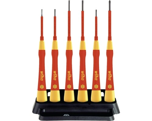 De uitdaging bij fijnmechanische schroefverbindingen is erin gelegen nauwkeurig en subtiel te werken, zonder het werkstuk te beschadigen. De fijnschroevendraaiers PicoFinish® van Wiha zijn dankzij hun lange, slanke handgrepen en de sneldraaizone ideaal voor fijne, gedetailleerde werkzaamheden bij elektrotechnische en fijnmechanische toepassingen en bij hobby en modelbouw. Het ergonomische handgreepdesign met zachte delen zorgt voor comfortabel werken. De soepel draaiende kap ondersteunt snel draaien met gevoel. Verder zorgen de opgedrukte schroevendraaierpictogrammen op de draaibare kap voor gemakkelijk selecteren van het juiste schroevendraaierprofiel. De geïsoleerde fijnschroevendraaiers worden conform de internationale norm IEC 60900 aan een 100% controle onderworpen en maken veilig werken mogelijk nabij onder spanning staande delen tot 1.000 V AC. De set bevat 6 fijnschroevendraaiers PicoFinish® en een houder. Daarin kunnen de fijnschroevendraaiers netjes worden opgeborgen op de werkplek.