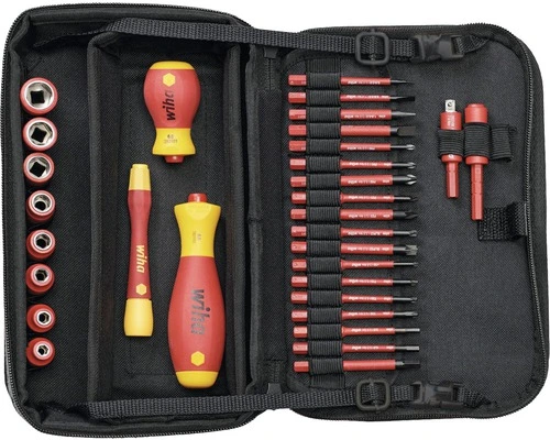Bij werkzaamheden op uiteenlopende locaties, zoals op bouwplaatsen, aan solarinstallaties en in schakelkasten, zijn veel verschillende schroefprofielen nodig. De 32-delige set dekt alle gangbare schroefprofielen af en is daarmee flexibel inzetbaar. Veilig opgeborgen en geordend in een robuuste functionele tas zijn de elektriciensgereedschappen perfect geschikt voor mobiel gebruik. Nog een pluspunt is de multifunctionele inzetbaarheid van de tas. In opengeklapte toestand fungeert deze als werkbankhouder voor gemakkelijk uitnemen van het gereedschap. De lus waarmee hij aan de muur kan worden opgehangen en de uitneembare inlegbodem vergroten zijn nut nog meer. De gereedschapset biedt maximale plaatsbesparing door een omvangrijk wisselbitsysteem. Dankzij de Wiha slimTechnology kunnen de inbegrepen slimBits met hun tot 33% slankere schachten ook diepliggende schroef- en veerelementen moeiteloos bereiken. In combinatie met de extra korte Stubby-handgreep kunnen in het bijzonder schroeven op krappe locaties moeiteloos worden bereikt. Voor fijne, gedetailleerde schroefwerkzaamheden is de PicoFinish® handgreep ideaal. De grote SoftFinish handgreep wordt juist gebruikt wanneer, in combinatie met de grotere slimBits-profielen, bij het schroeven meer kracht moet worden uitgeoefend. Elk stuk gereedschap in de set is conform de internationale norm IEC 60900 aan een 100% controle onderworpen waardoor er veilig mee kan worden gewerkt aan onder spanning staande delen tot 1.000 V AC.
